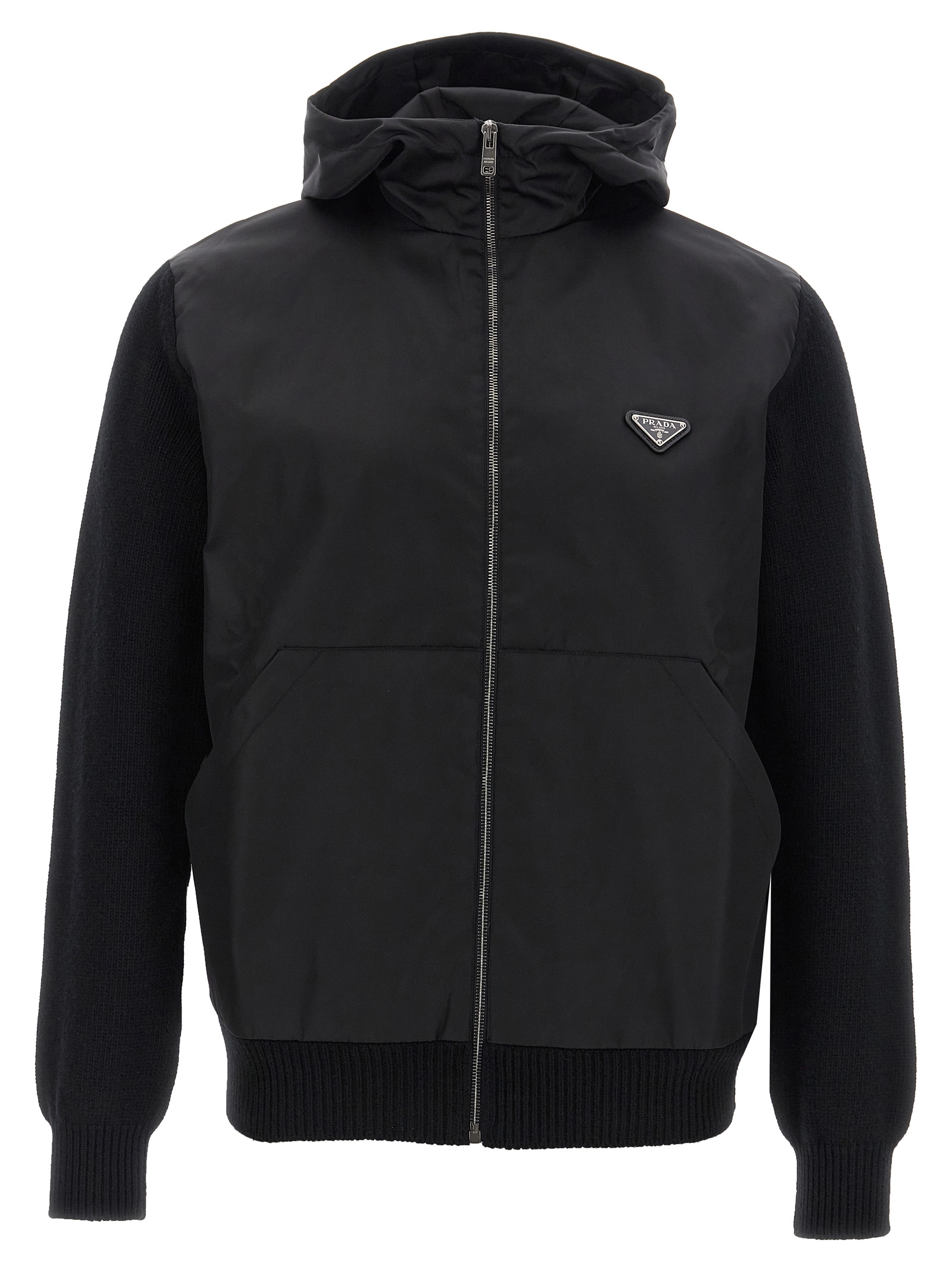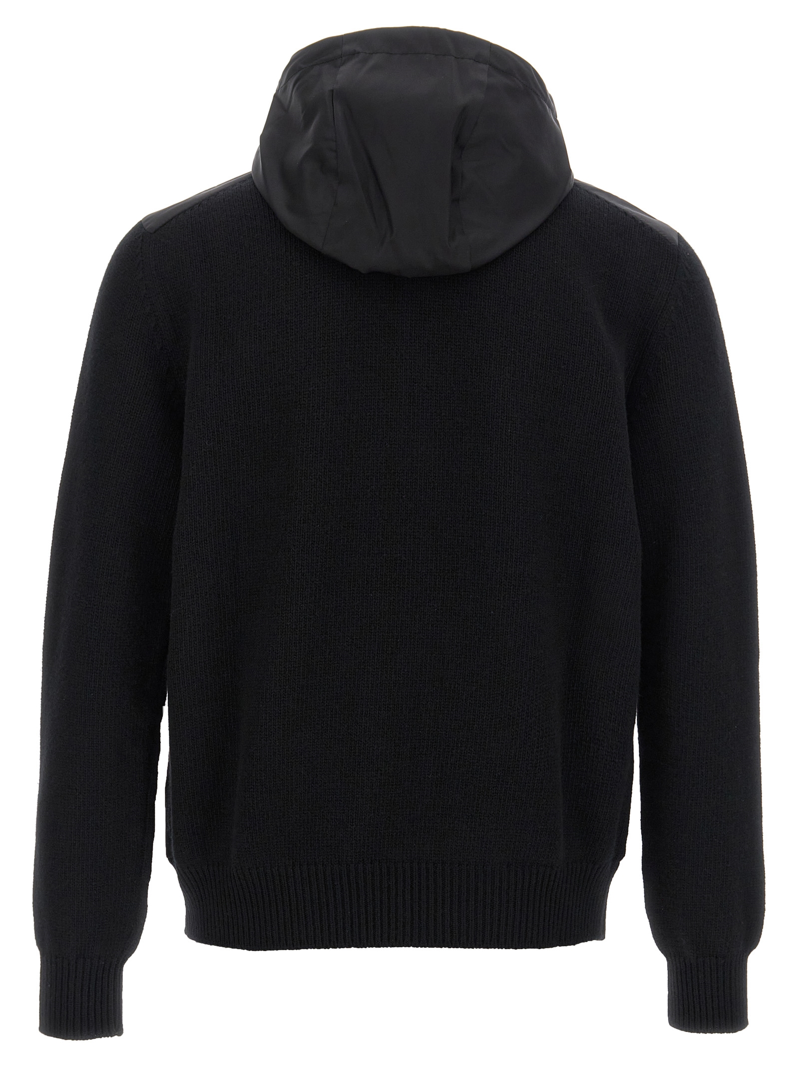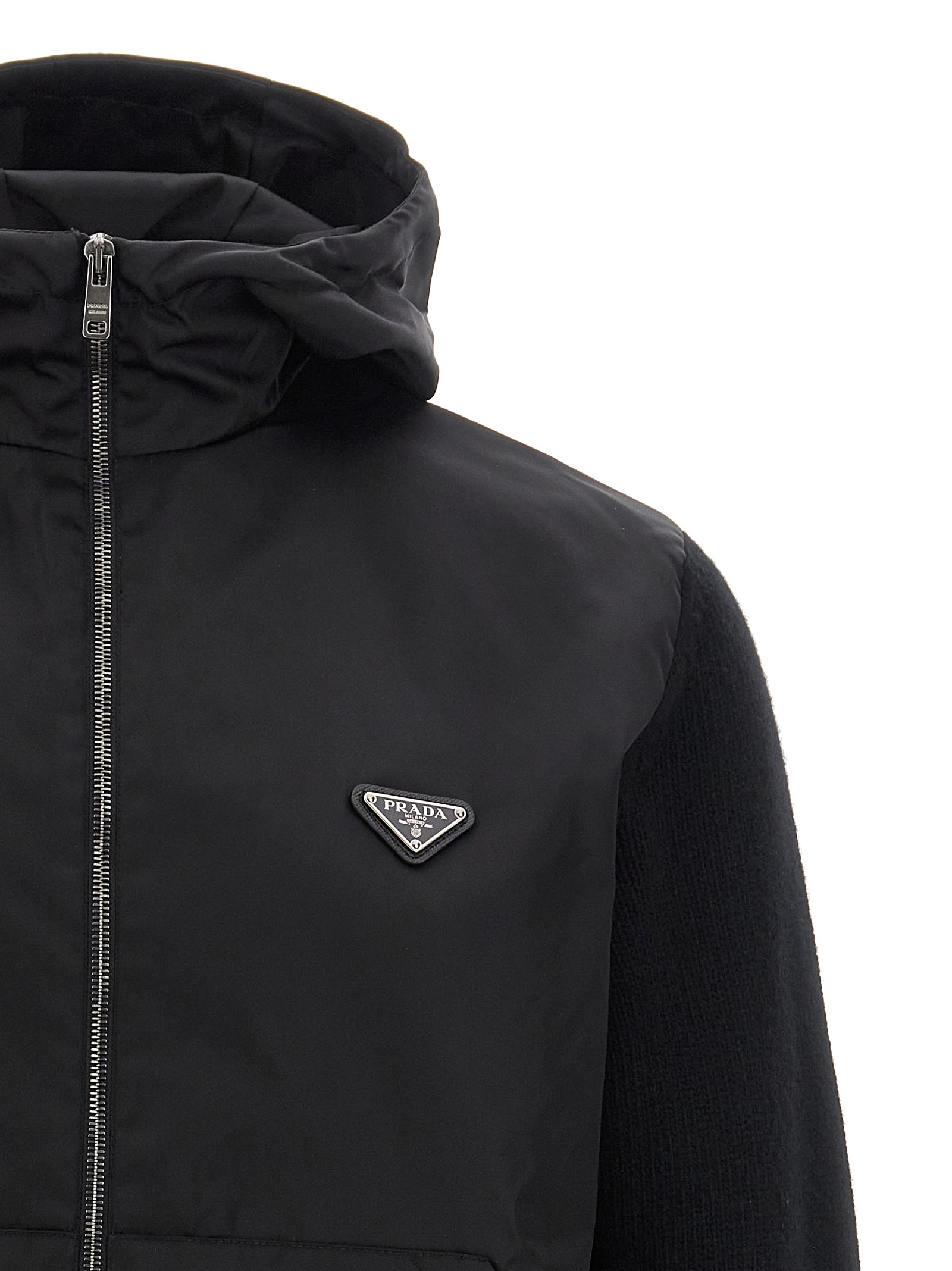 Wool and cashmere blend cardigan with Re-Nylon front insert, enameled metal triangle logo on front, drawstring hood, zipper closure, pockets, long sleeve with cuff. SUSTAINABLE: Made from Re-Nylon, a regenerated yarn made by recycling and purifying plastics collected from oceans, fishing nets and textile fibers. fibers.Характеристики товара
