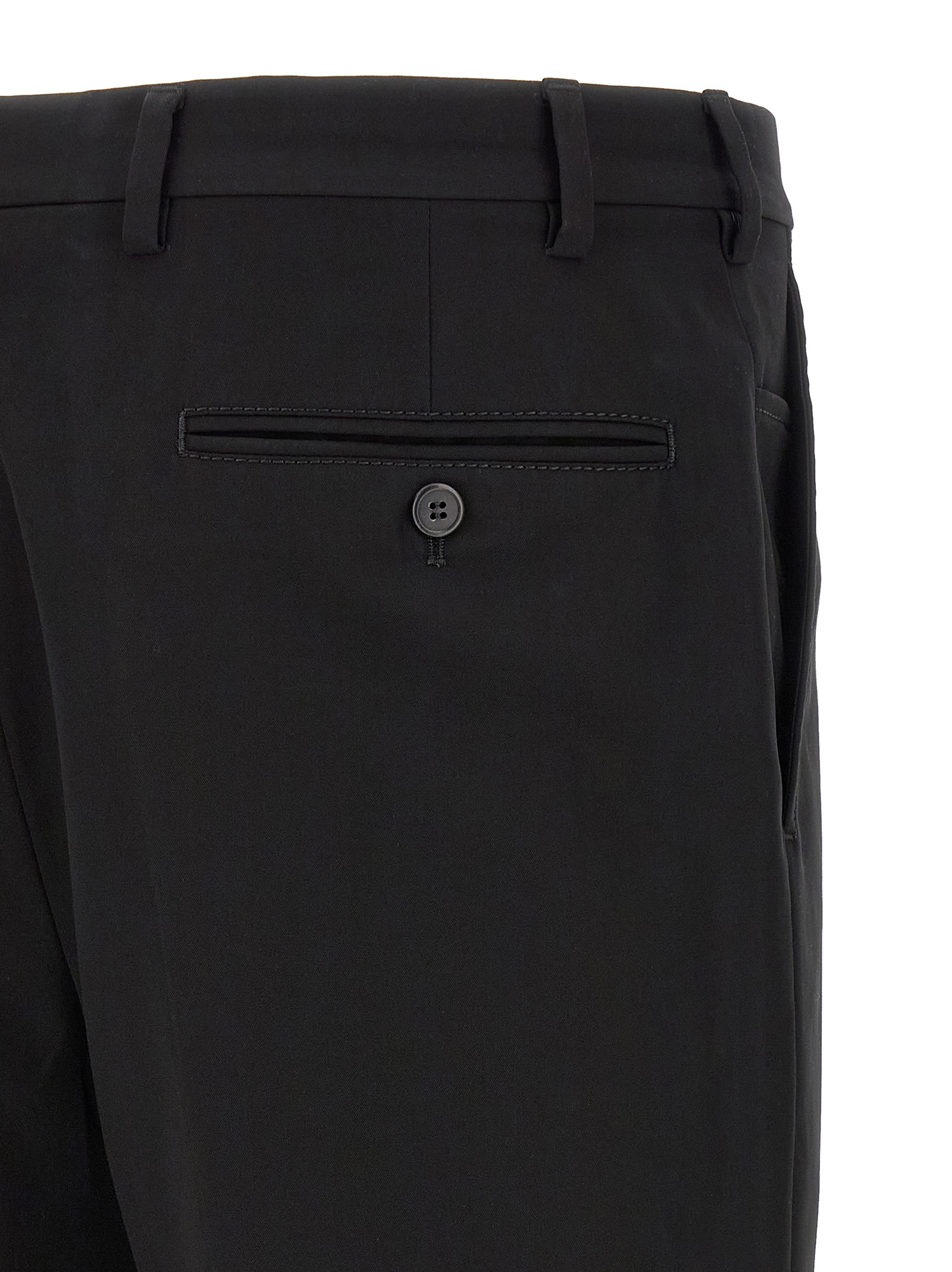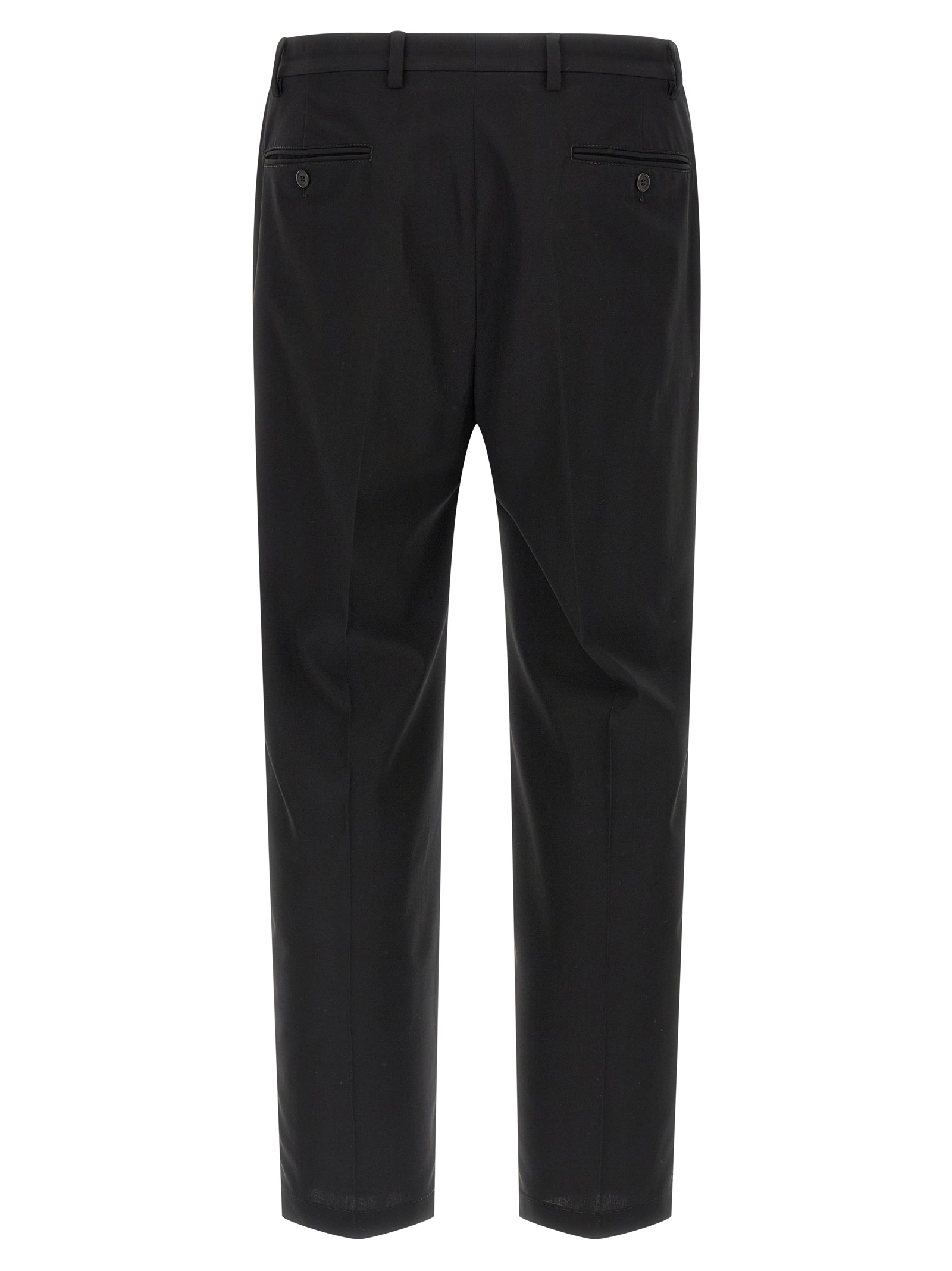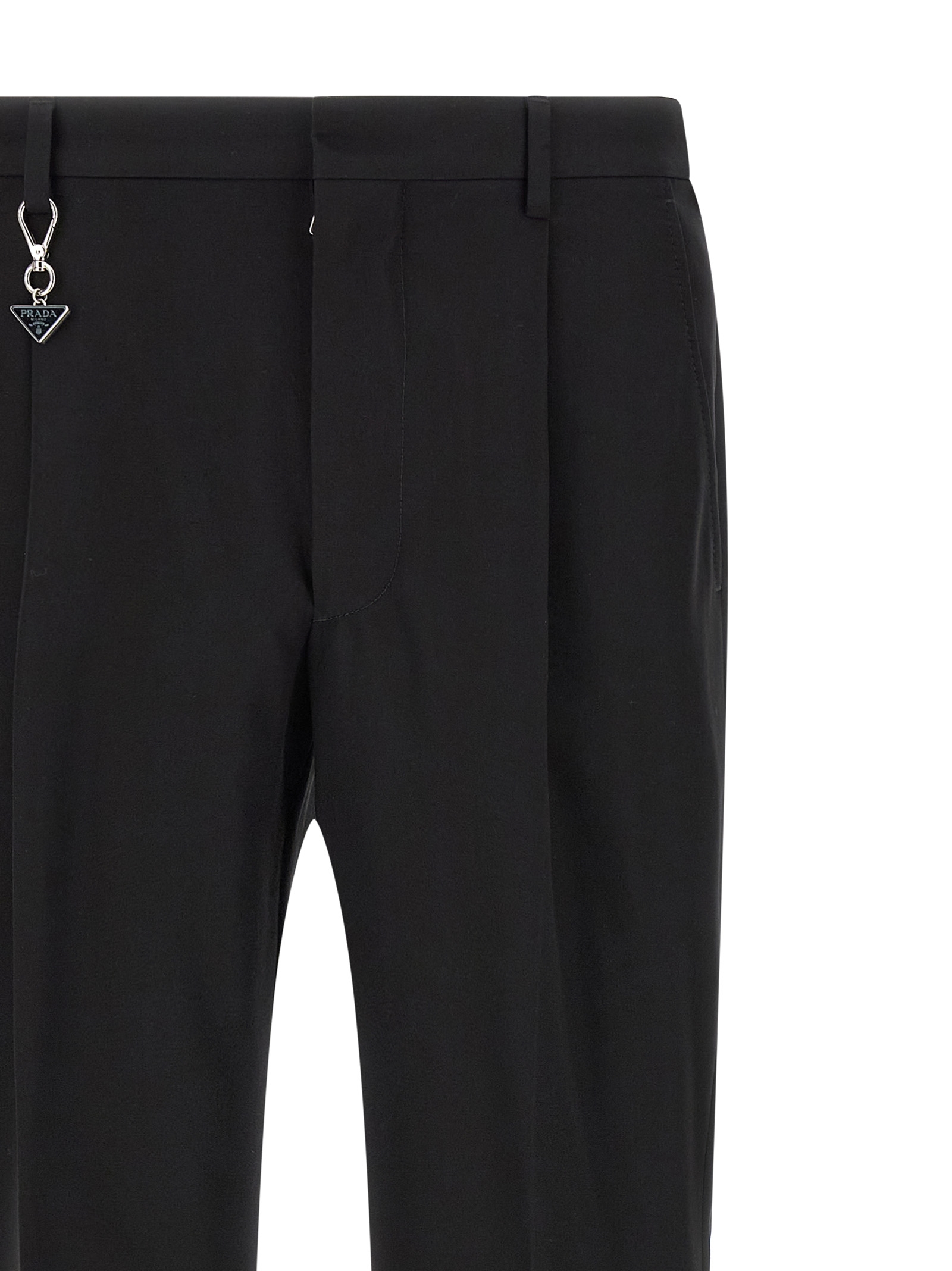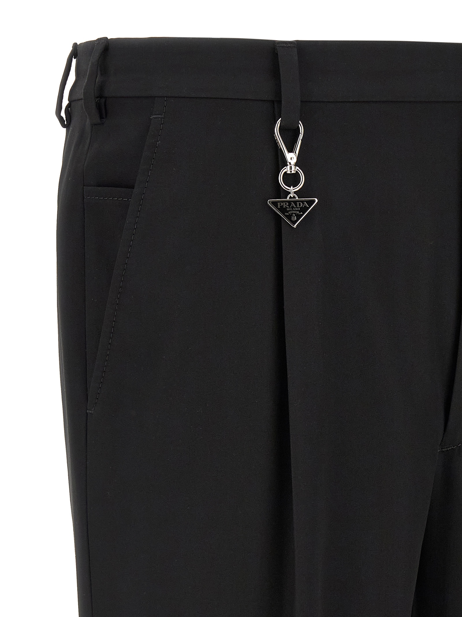 Travel cotton trousers, viscose lining, pin tucks, stretched pleat, straight leg, front zip hook and button closure, front American pockets, back welt pockets, removable enameled metal triangle logo keyring.