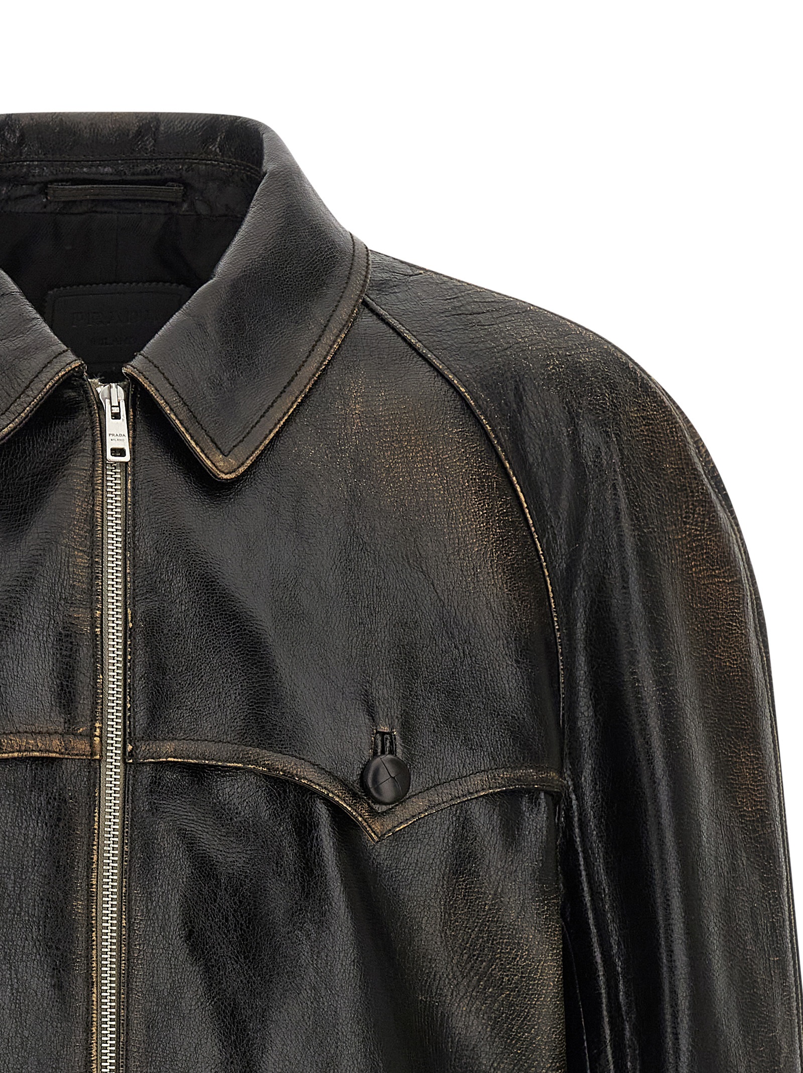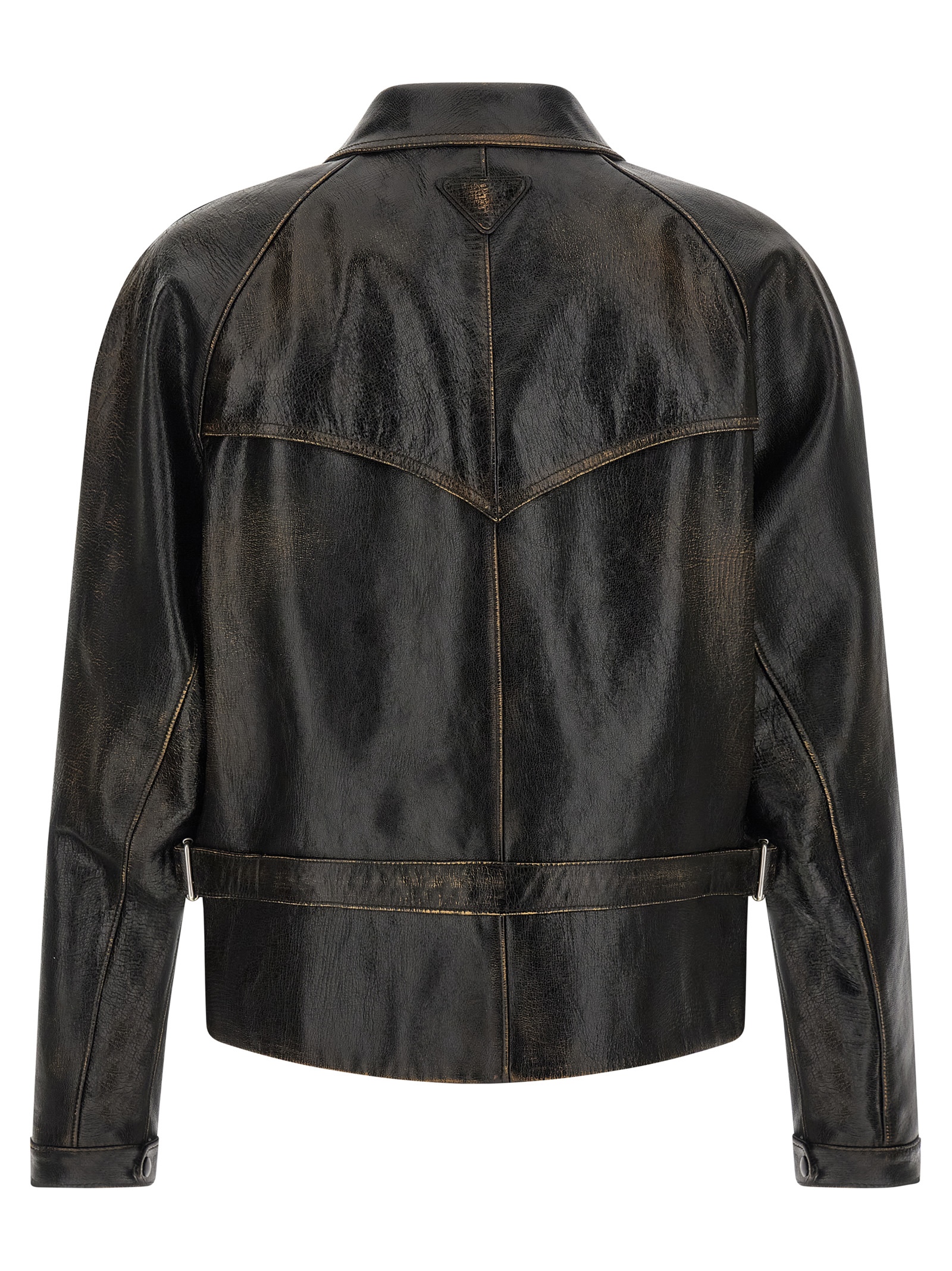 Vintage-effect leather jacket with shirt collar, front zip closure, raglan sleeves, front pockets with flap and button, triangle leather logo on the back, long sleeves with cuffs.Характеристики товара