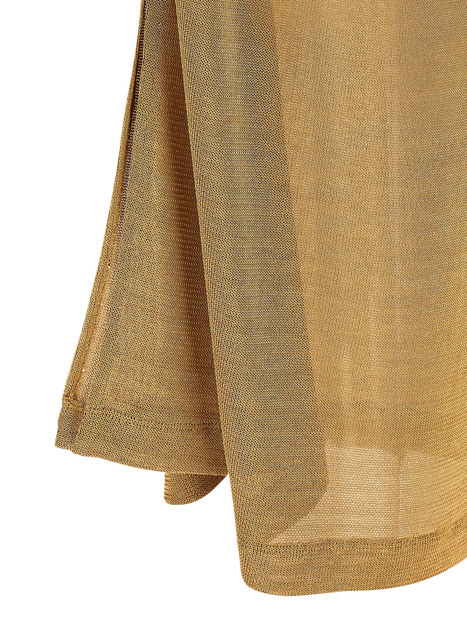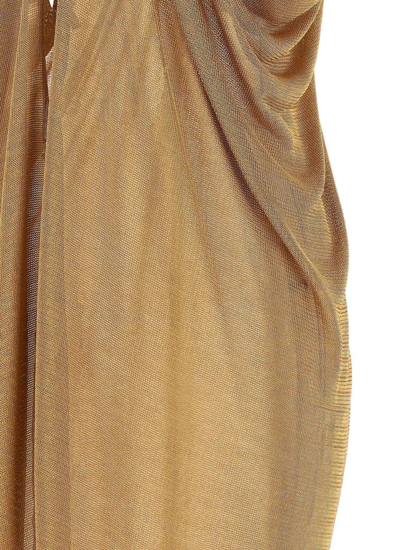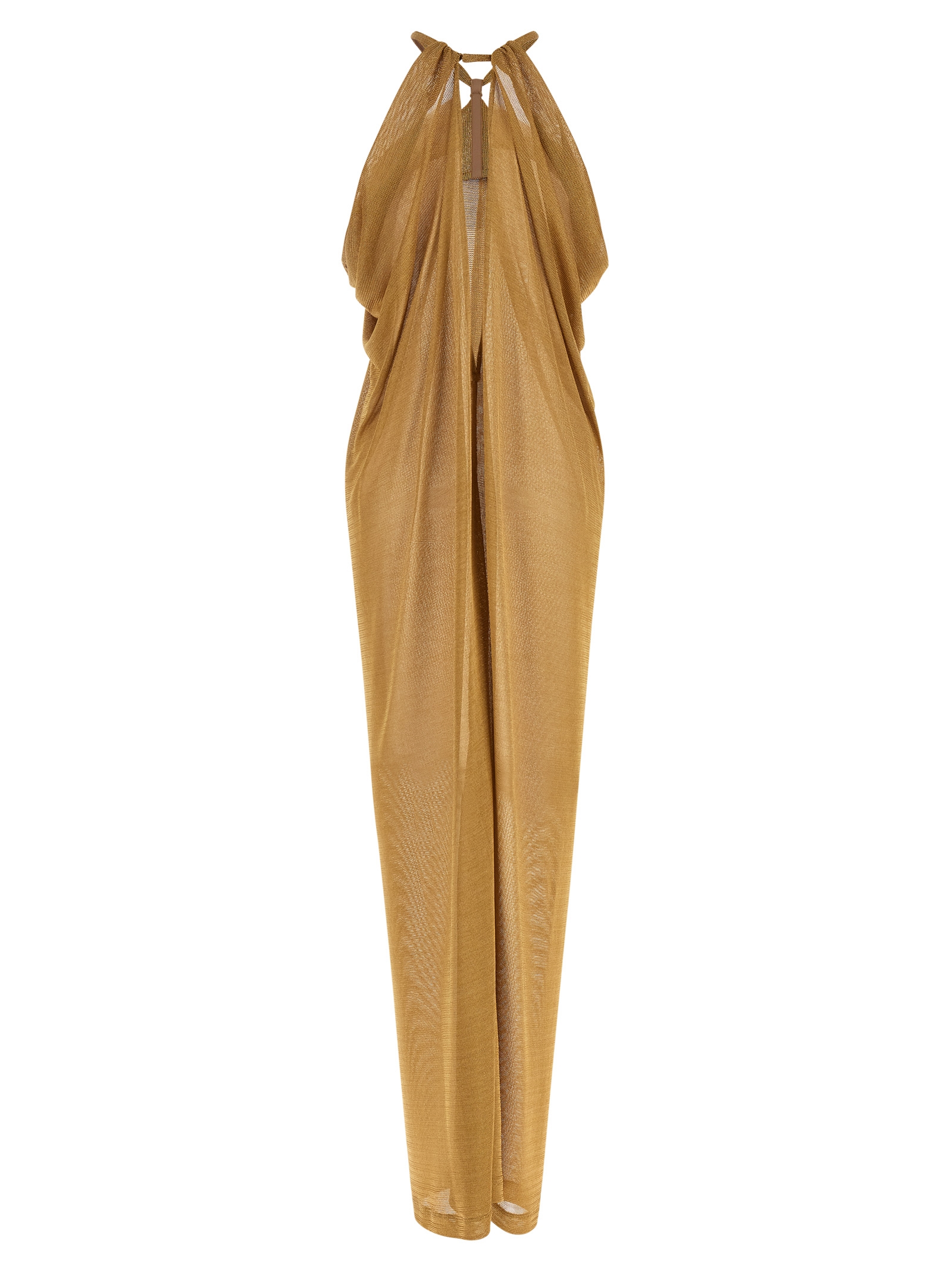 Long dress in semi-transparent lurex with fluid draping on the sides, American neckline with fully exposed back, necklace-effect neck closure, sleeveless, back split.