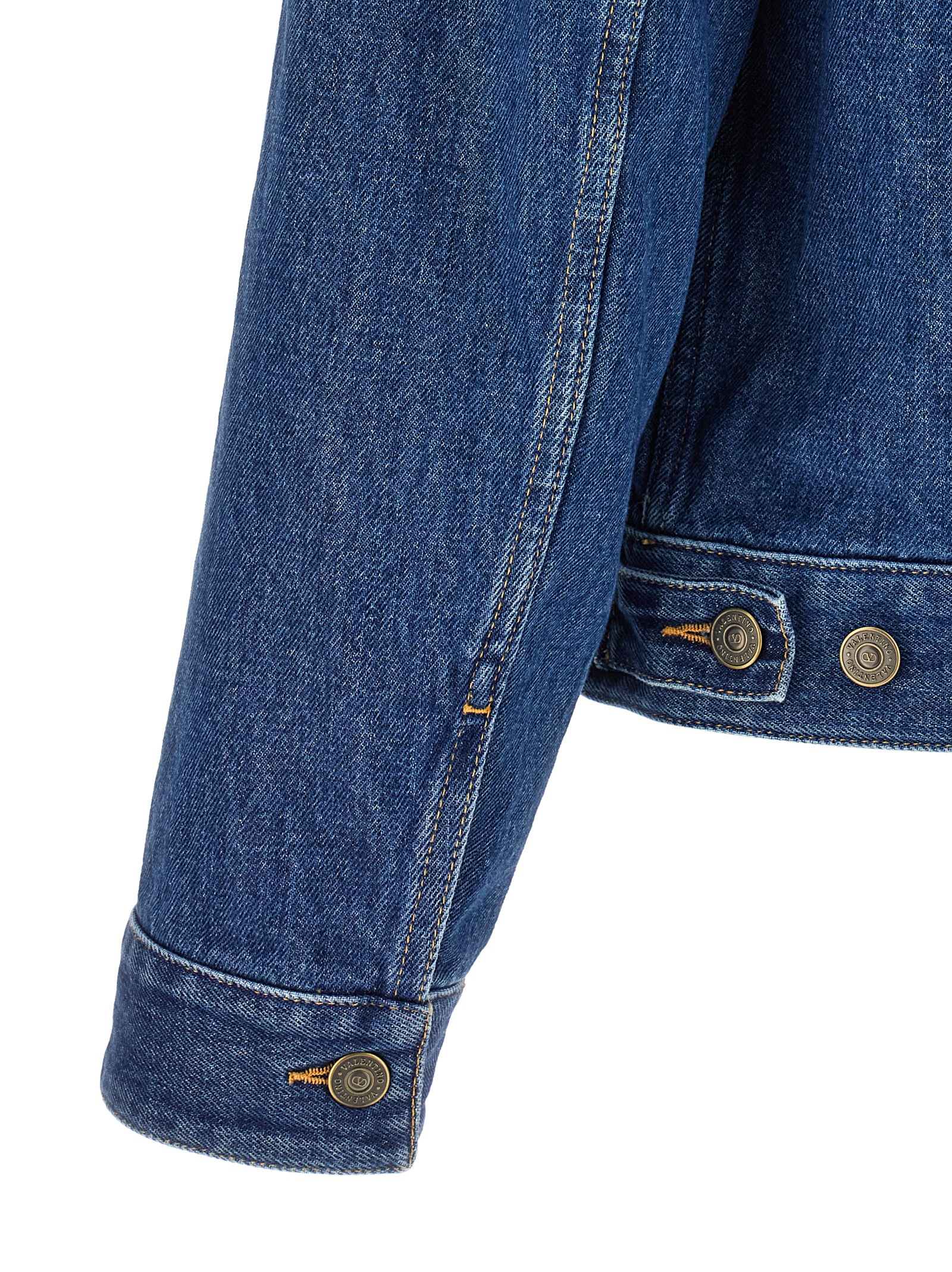 'Valentino' jacket in cotton denim with contrast stitching, pocket with VGold metal antiqued detail, shirt collar, front button closure, pockets, long sleeves with cuffs and slightly dropped shoulder.