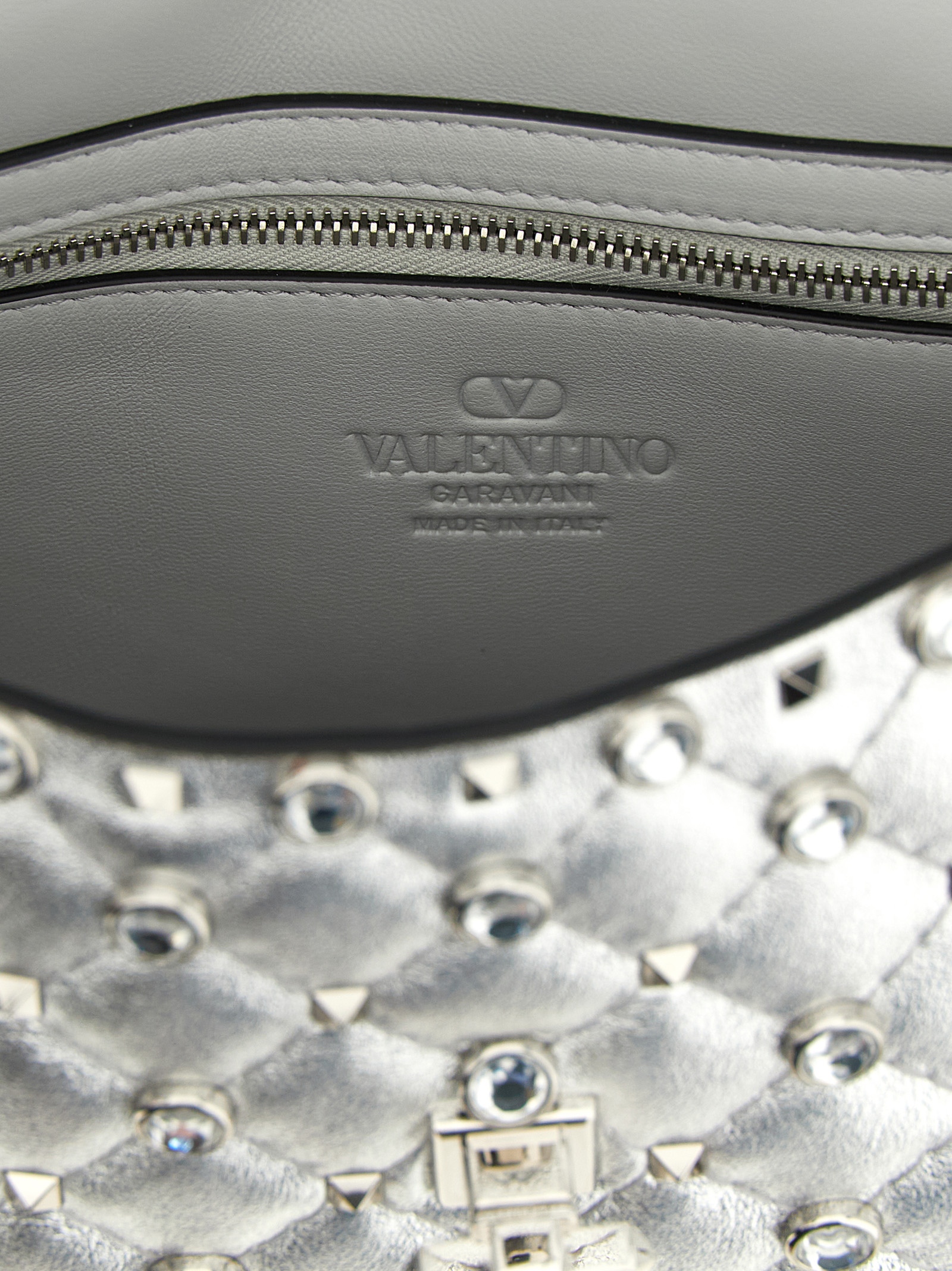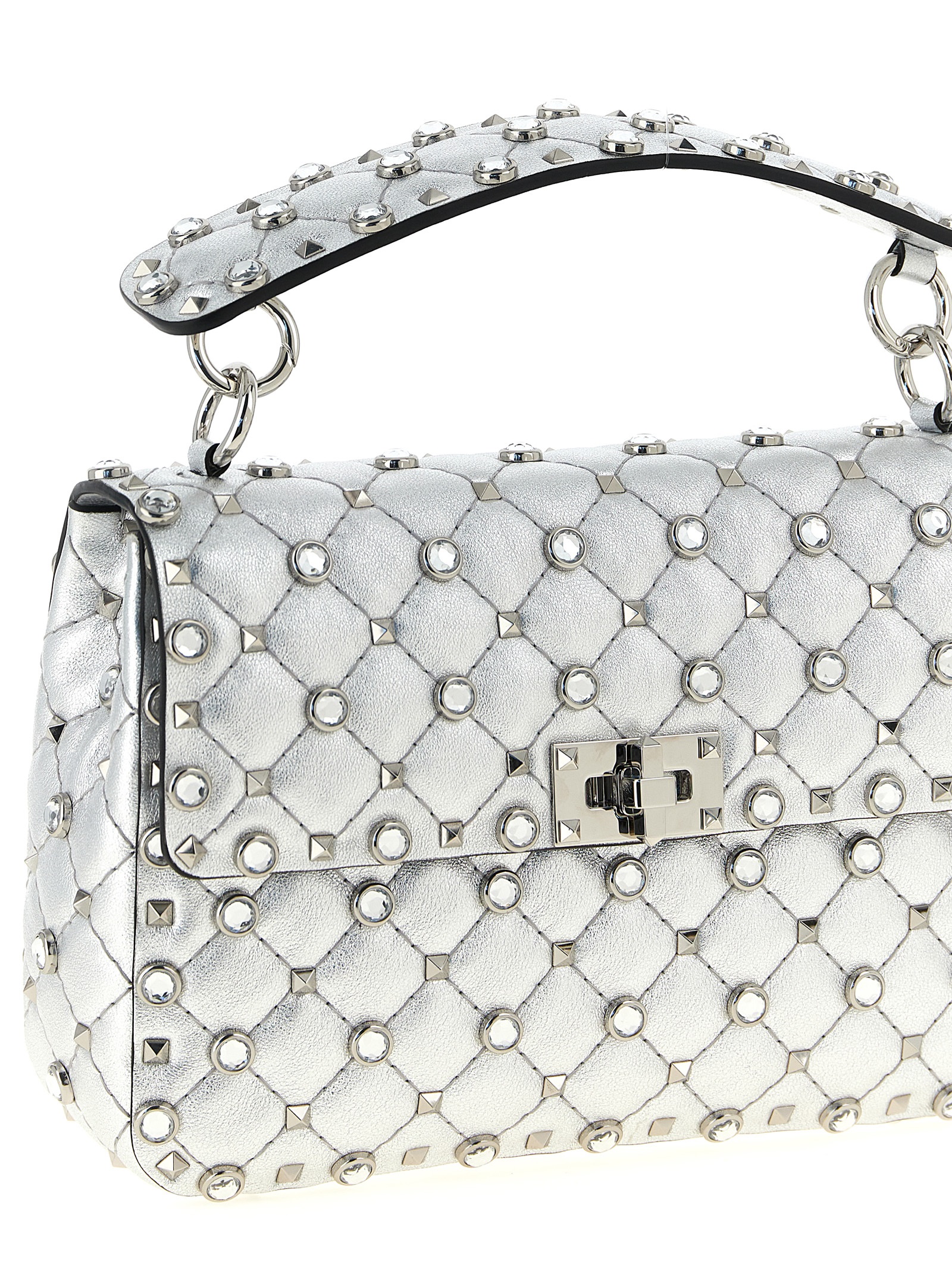 Сумка через плечо 'Rockstud Spike' из ламинированной мягкой кожи наппа с металлическими заклепками и кабошонами по всей поверхности, клапан с металлическим замком, съемная ручка, подкладка из кожи наппа, два внутренних кармана, съемный плечевой ремень-цепочка.Характеристики товара