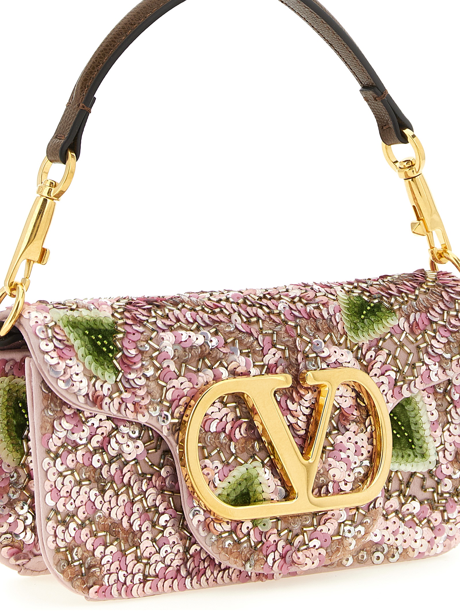 Маленькая сумка через плечо «Locò» из атласа, вышитая пайетками, куветтами, микробисером, трубчатым бисером из стекла и цветочным гранатовым узором на телячьей коже, атласная подкладка, магнитная застежка-клапан с латунной фирменной надписью «VLogo Signature» с эффектом состаривания на передней части, короткая съемная кожаная ручка, съемный плечевой ремень-цепочка.Характеристики товара