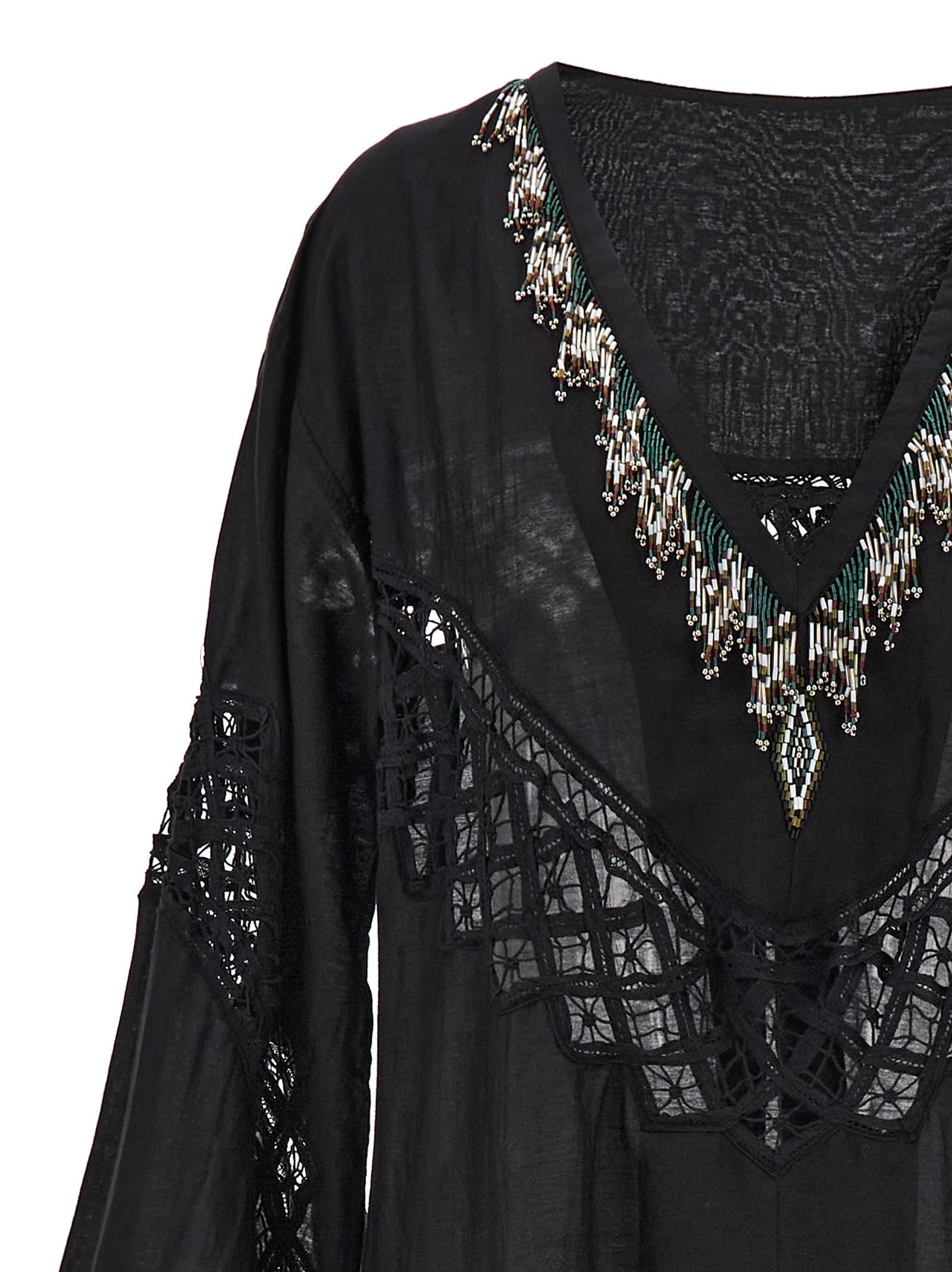 'Alice' dress in cotton and silk blend with beads and perforated details, V-neck, long and wide sleeves, front split on the hem.
