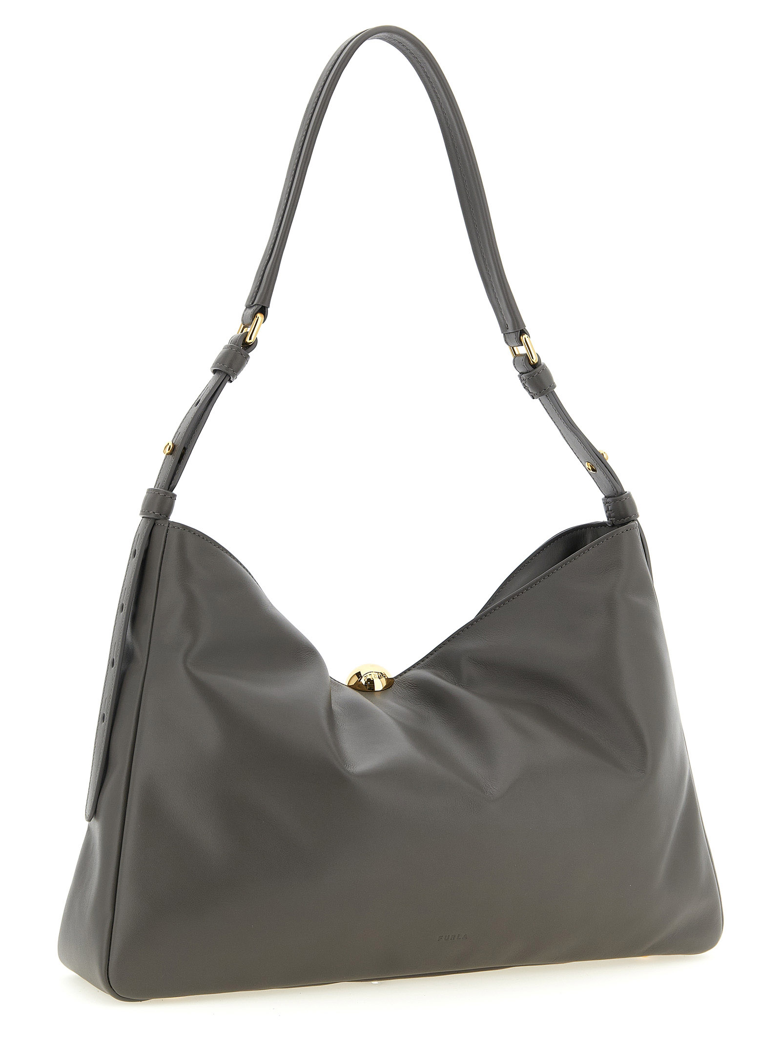 Large 'Furla Sfera Soft' shoulder bag in padded smooth nappa leather, magnet button closure decorated with ball hardware, front embossed logo, adjustable handle, rigid base with metal feet.