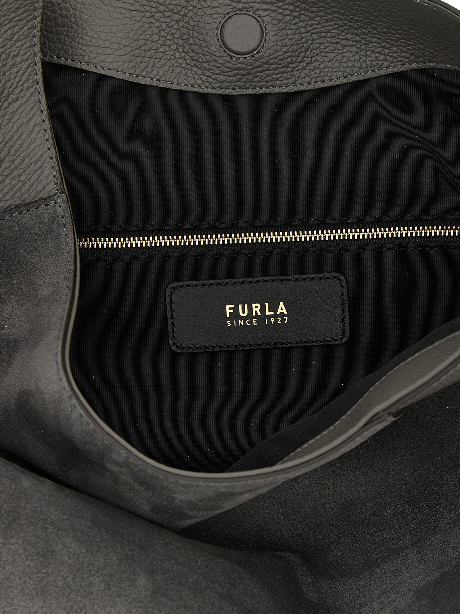 'Furla Lara' large shoulder bag in suede and smooth tone-on-tone calf leather, front metal lettering logo, magnetic closure, fixed handle with iconic Arco logo with metal ball element.