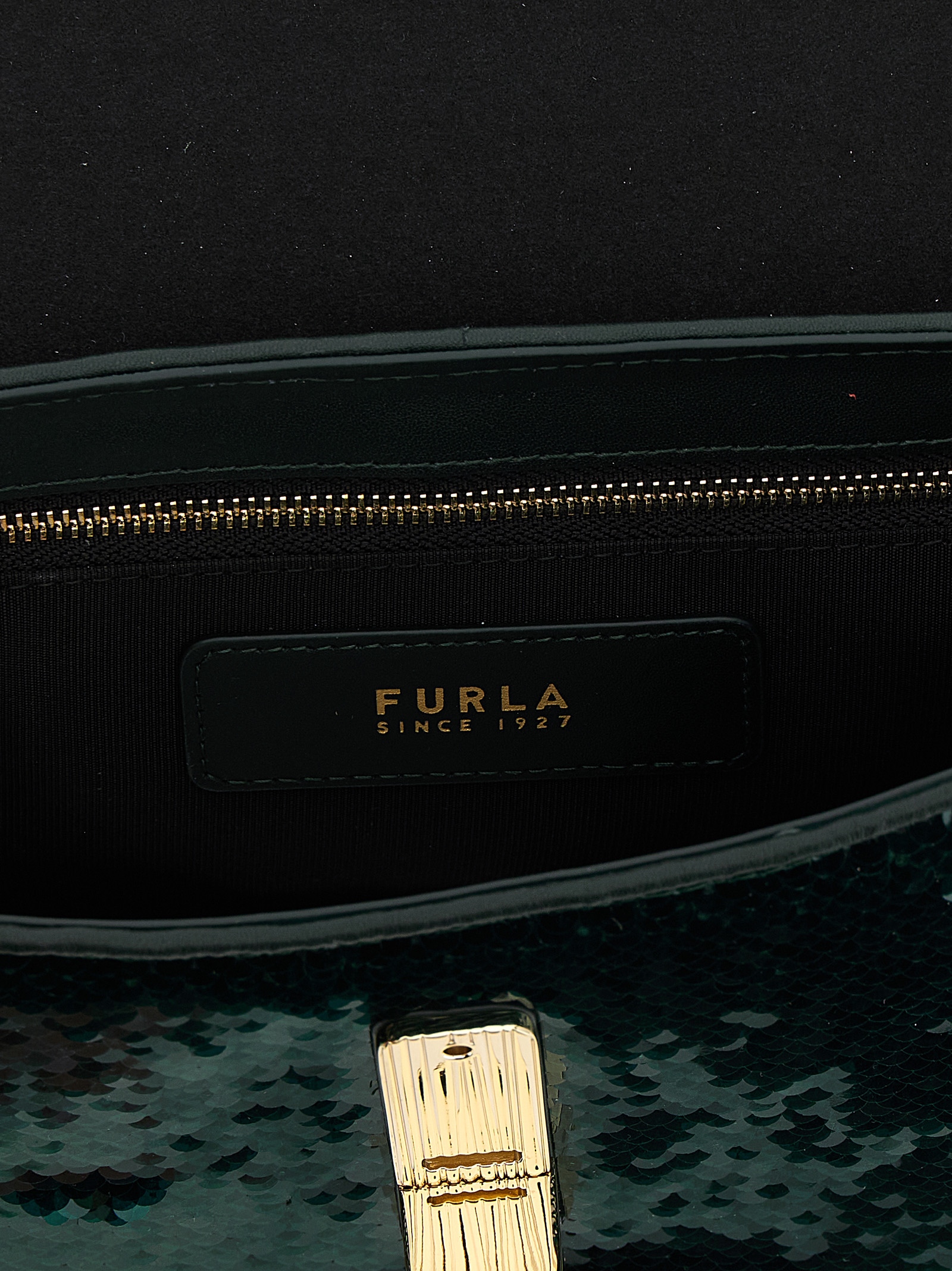 Small 'Furla Iride' crossbody bag in fabric covered with sequins, magnetic flap closure with cylindrical metal hardware with Arco Furla logo, adjustable and removable leather shoulder strap.