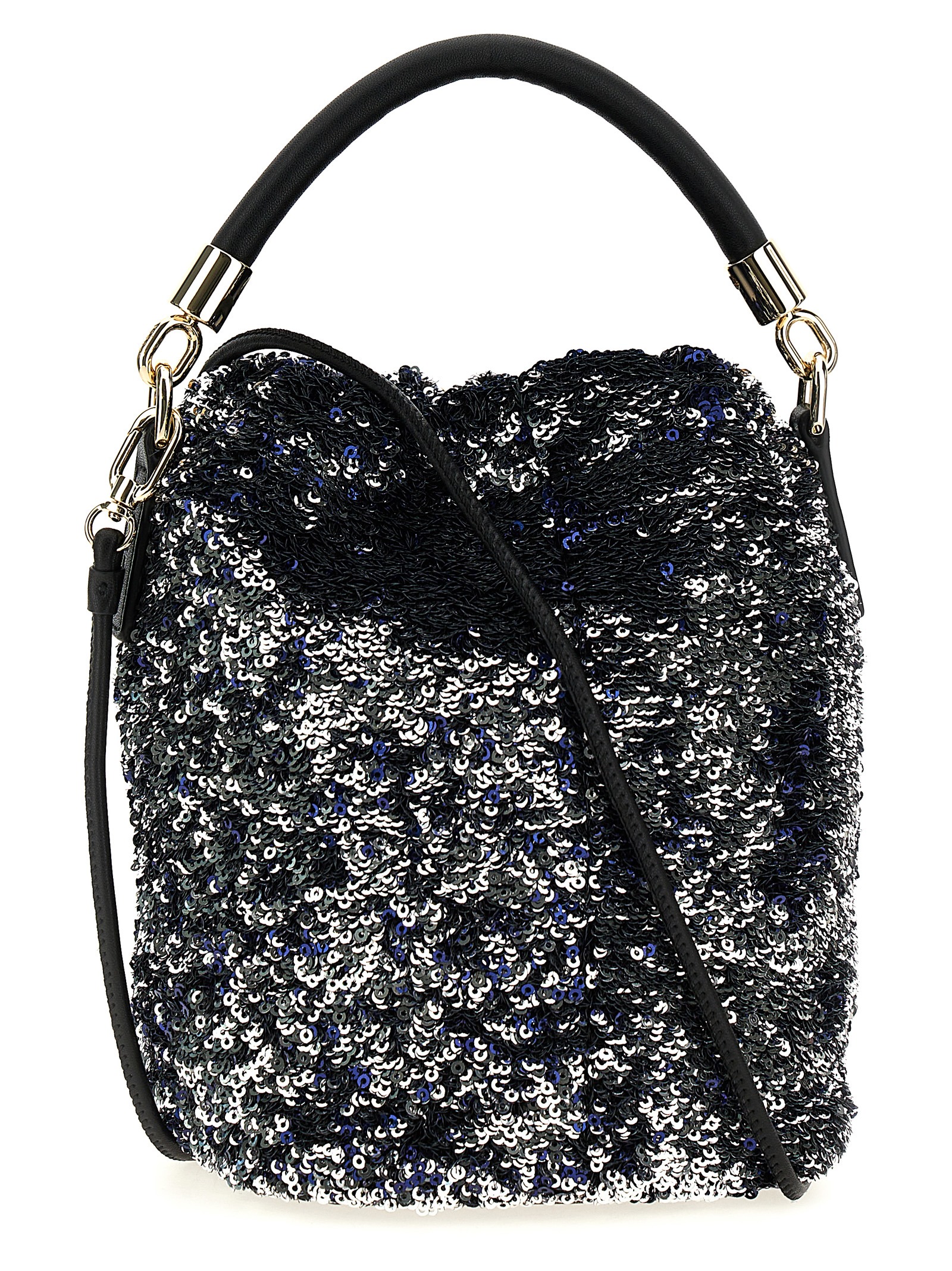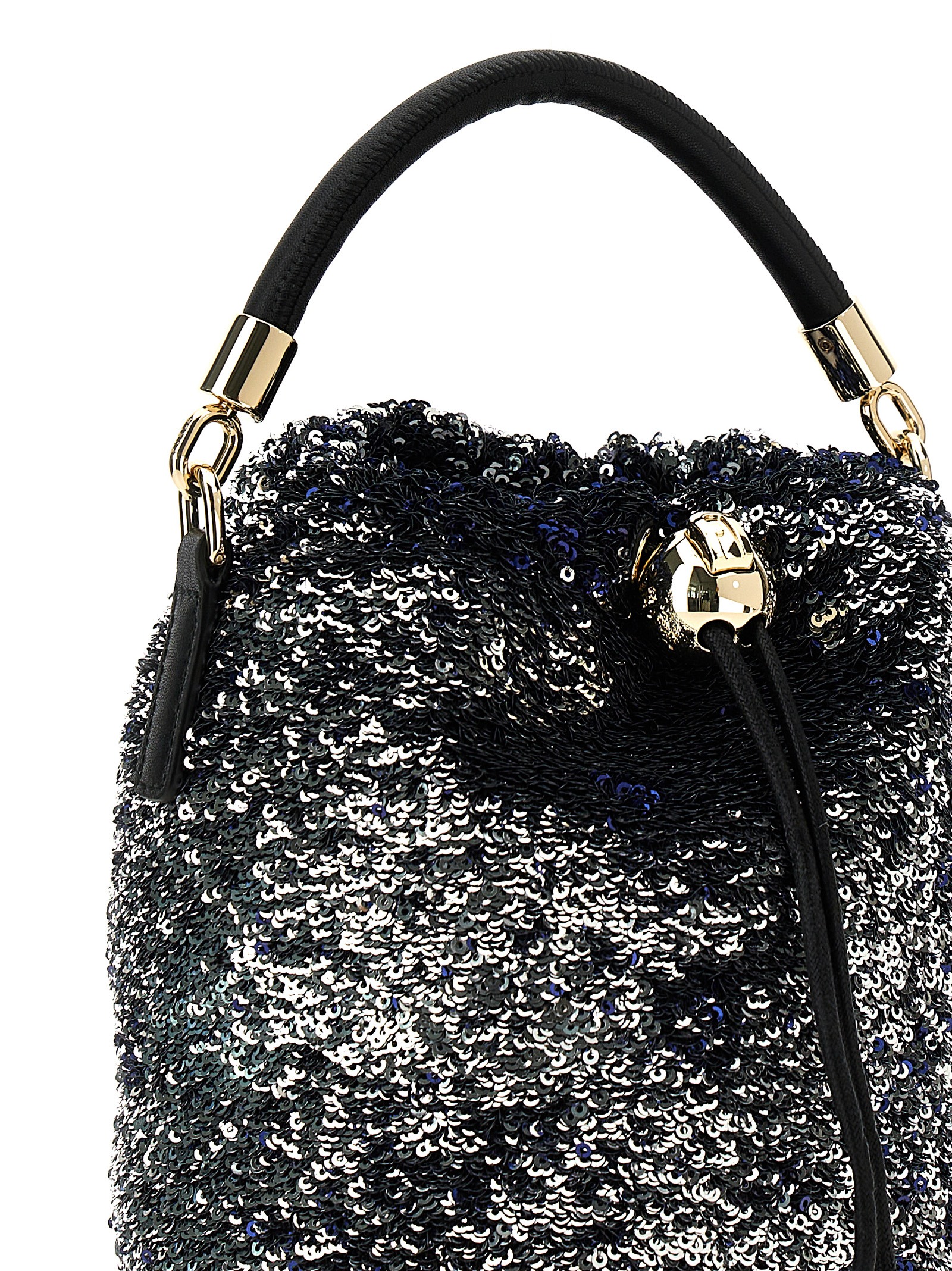 Сумка Mionido из ткани, полностью покрытой пайетками, с кожаной ручкой, застежкой на шнурке с металлическим логотипом и съемным кожаным плечевым ремнем.Характеристики товара