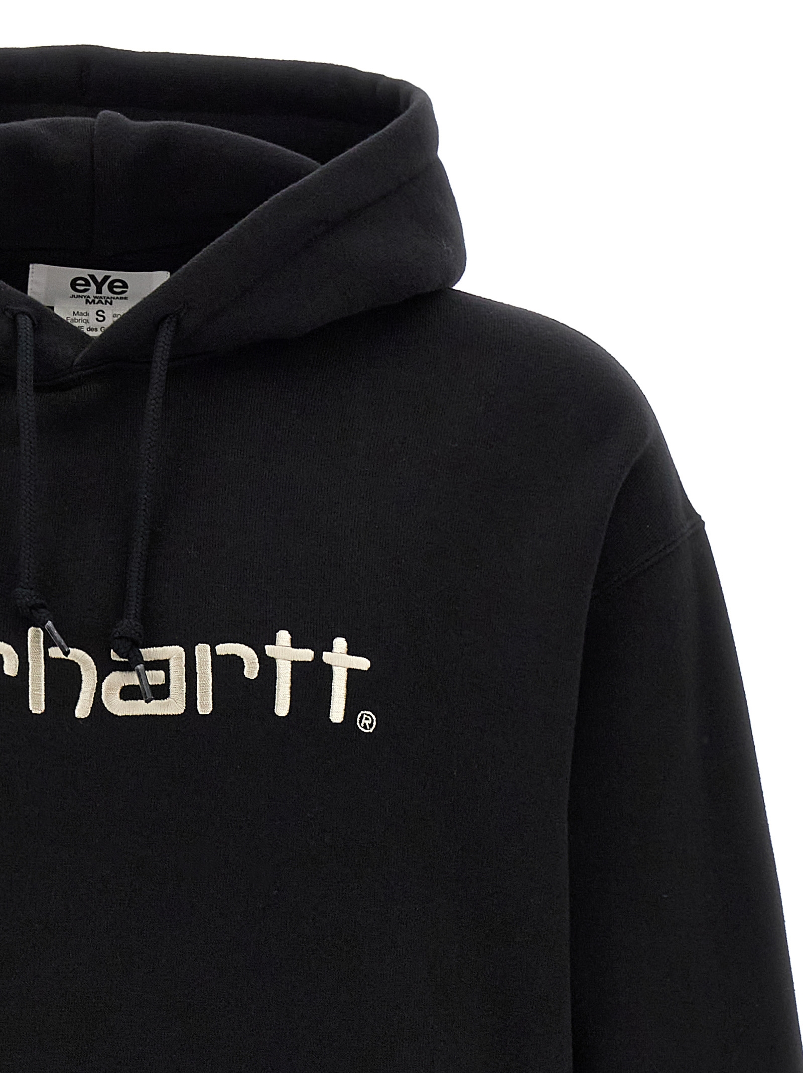 Junya Watanabe x Carhartt hoodie in fleece cotton with front logo embroidery, back print, kangaroo pocket, long cuffed sleeves and dropped shoulders.