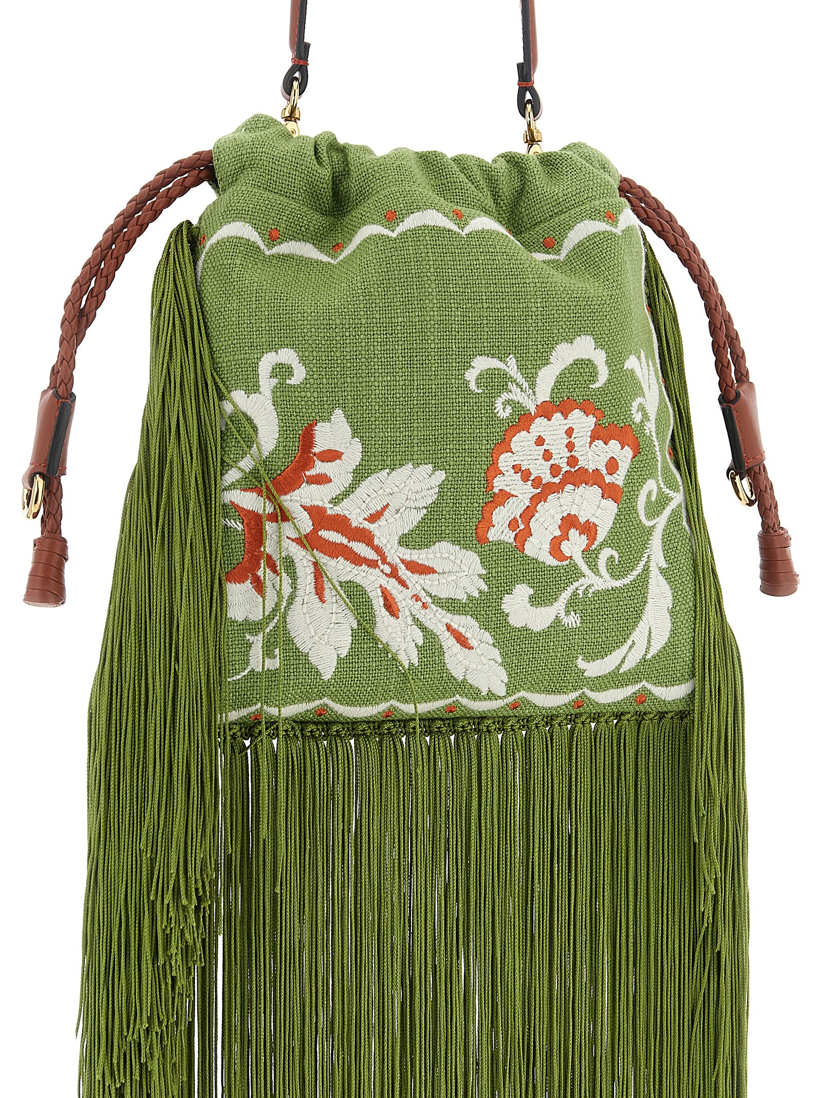 Small 'Kalispera' handbag in linen and viscose blend, contrasting lining, pouch design, front floral embroidery, back embroidery, long fringes at the edges, braided leather drawstring closure, removable leather handle