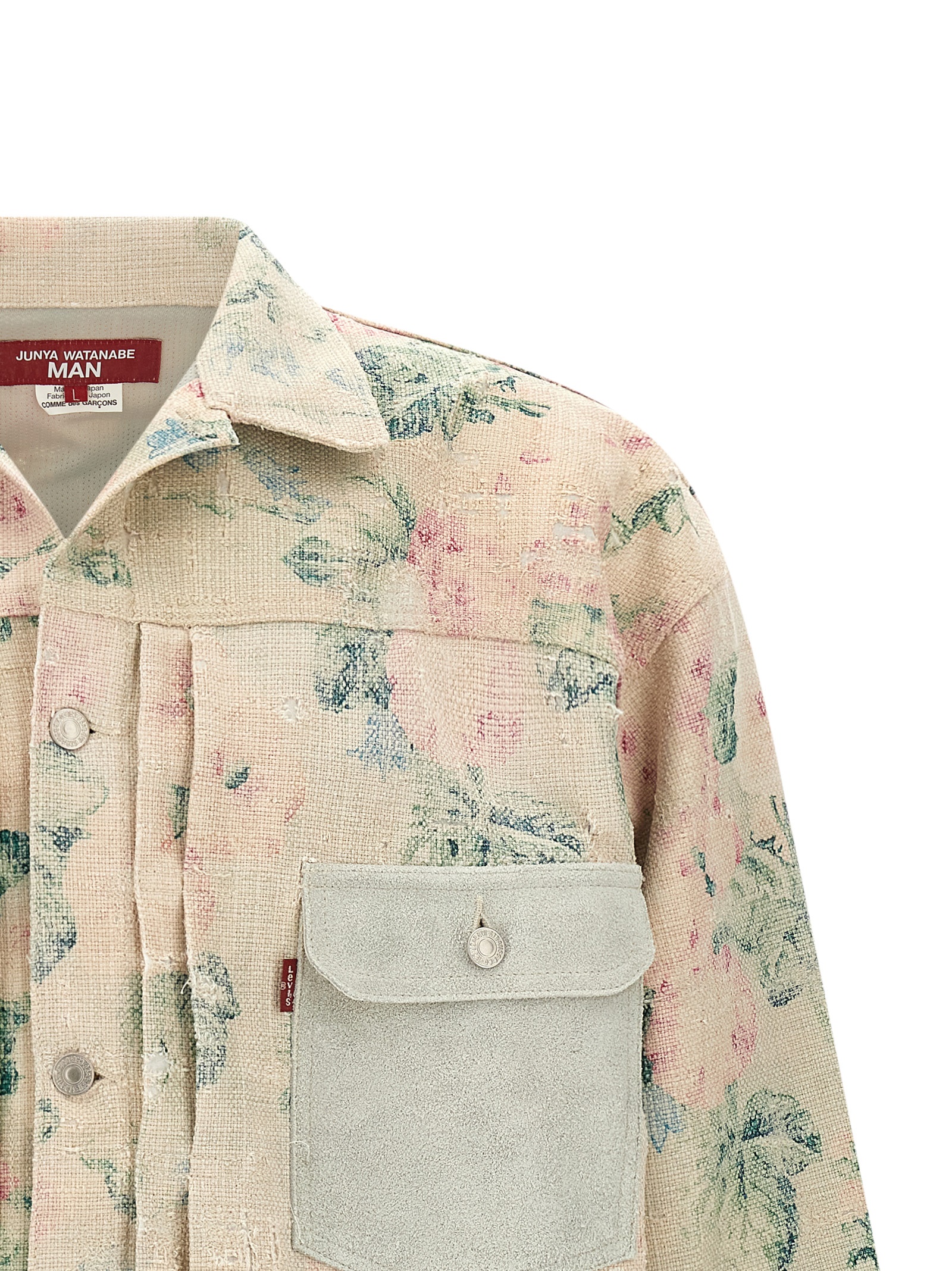 Куртка Junya Watanabe x Levi's® из жаккардовой ткани с цветочным узором, изготовленной из смеси вискозы и льна и подвергнутой обработке для защиты от старения и повреждений. Застежка-клеш спереди и сзади, воротник рубашечного типа, контрастный замшевый карман спереди, застежка на металлические пуговицы спереди, длинные рукава с манжетами и приспущенными плечами, сетчатая подкладка.
