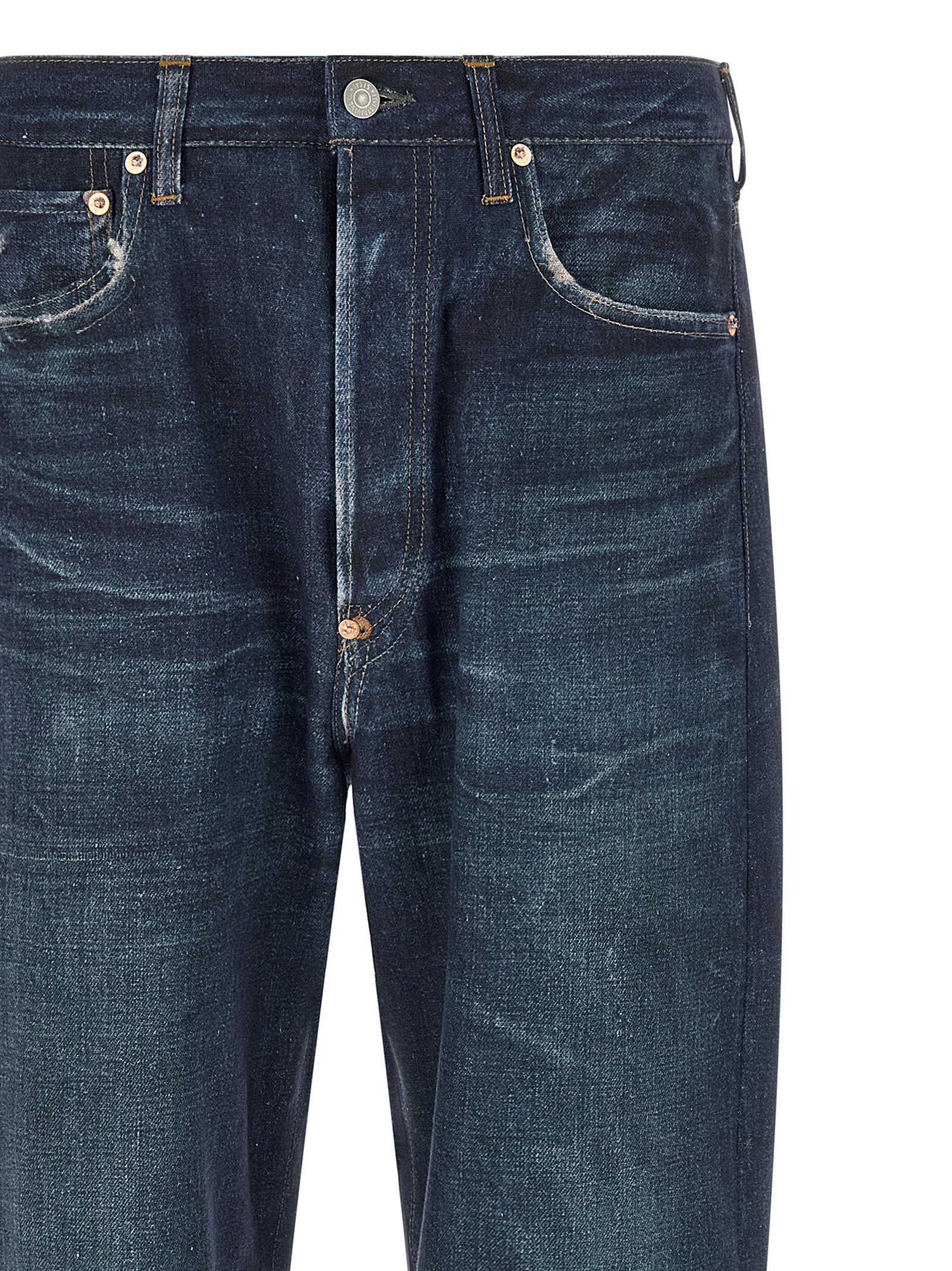 Джинсы Junya Watanabe x Levi's® из смесовой хлопково-льняной ткани с эффектом потертости, контрастной строчкой, широкими прямыми штанинами, высокой талией, застежкой на пуговицы спереди, пятью карманами и биркой с логотипом сзади.