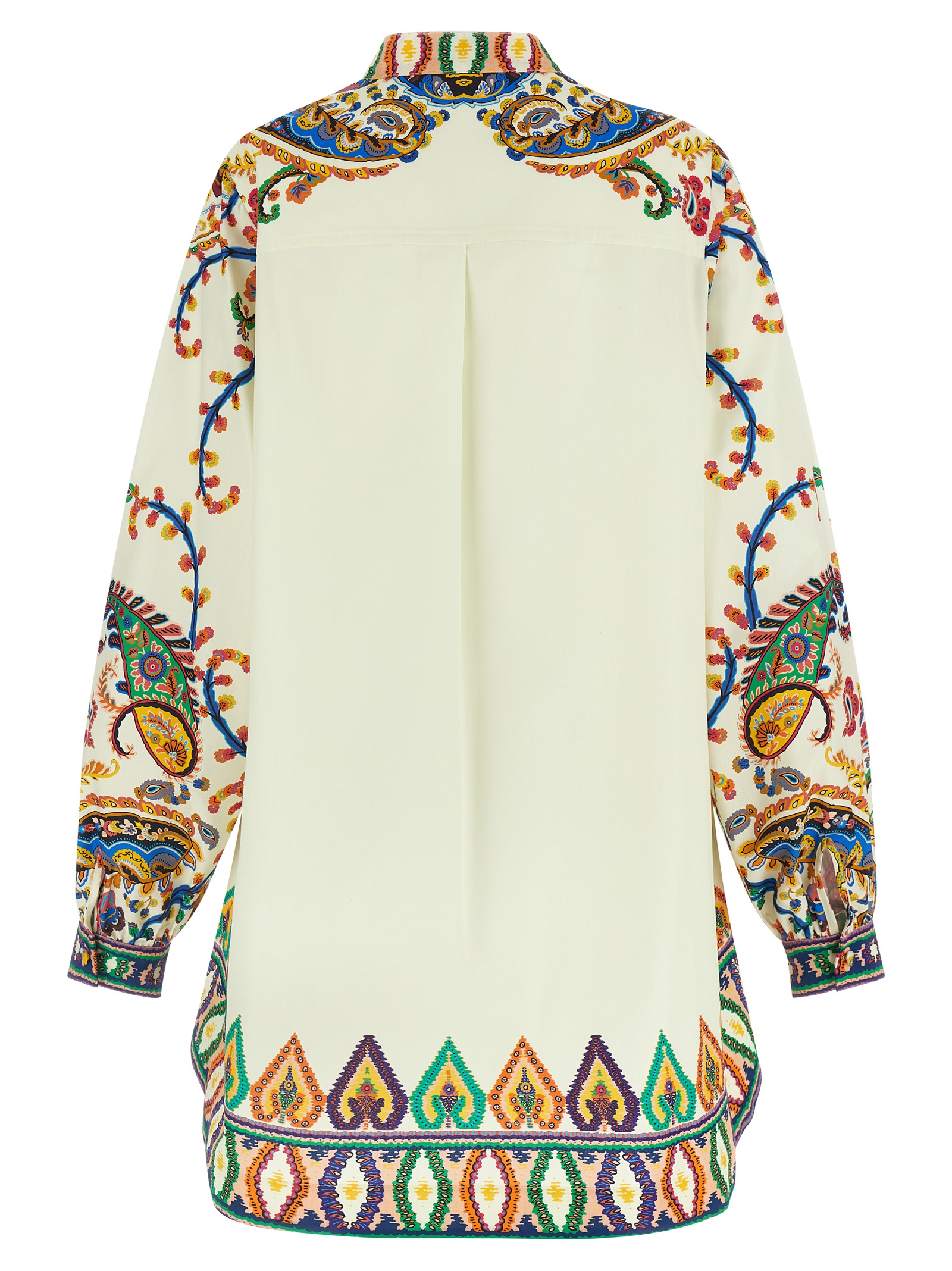 Cotton poplin mini dress with Paisley print placed, mandarin collar, front closure with covered buttons, side pockets, round hem, long wide sleeves on the slightly curled hem with button-opening cuffs.