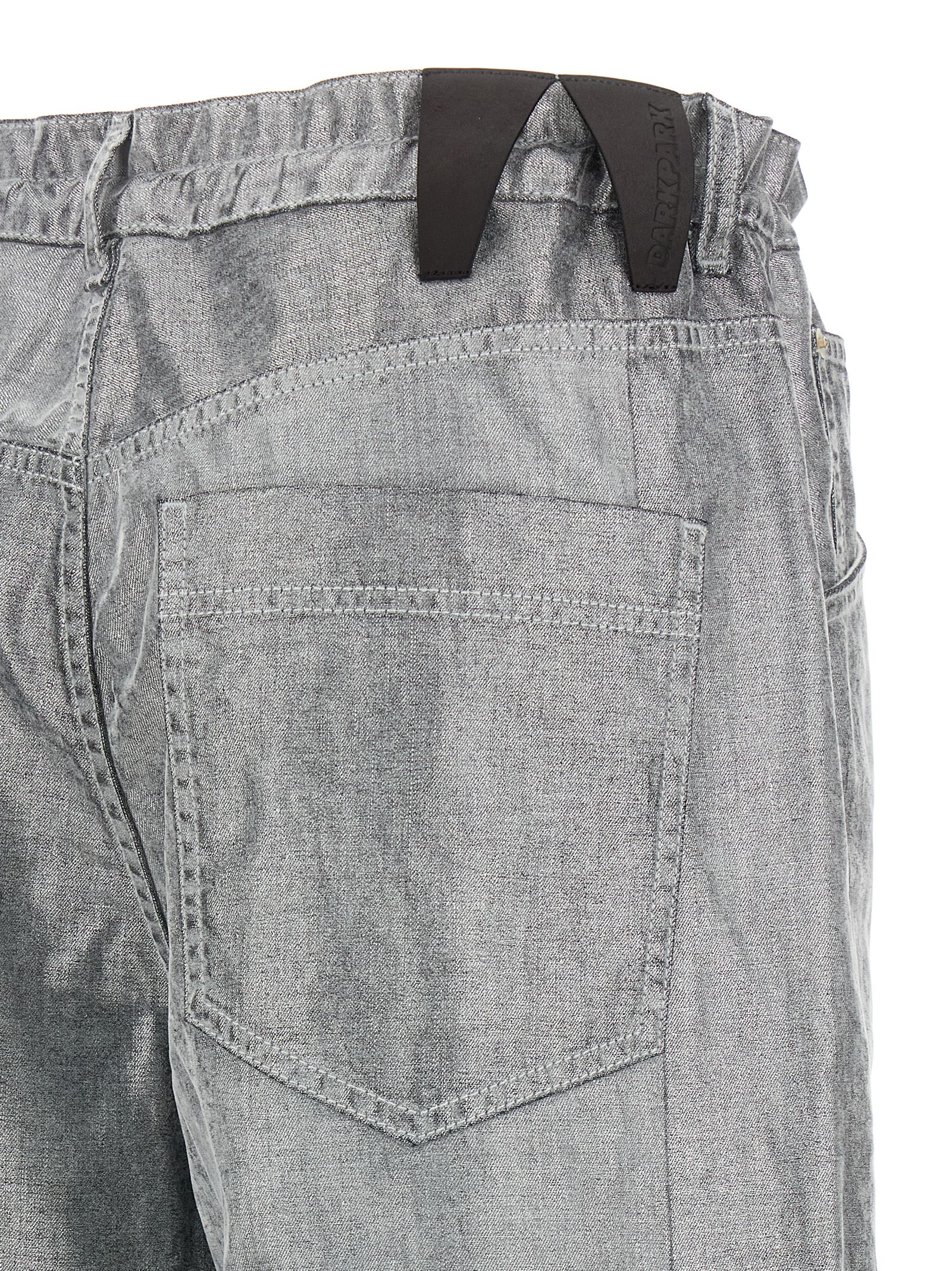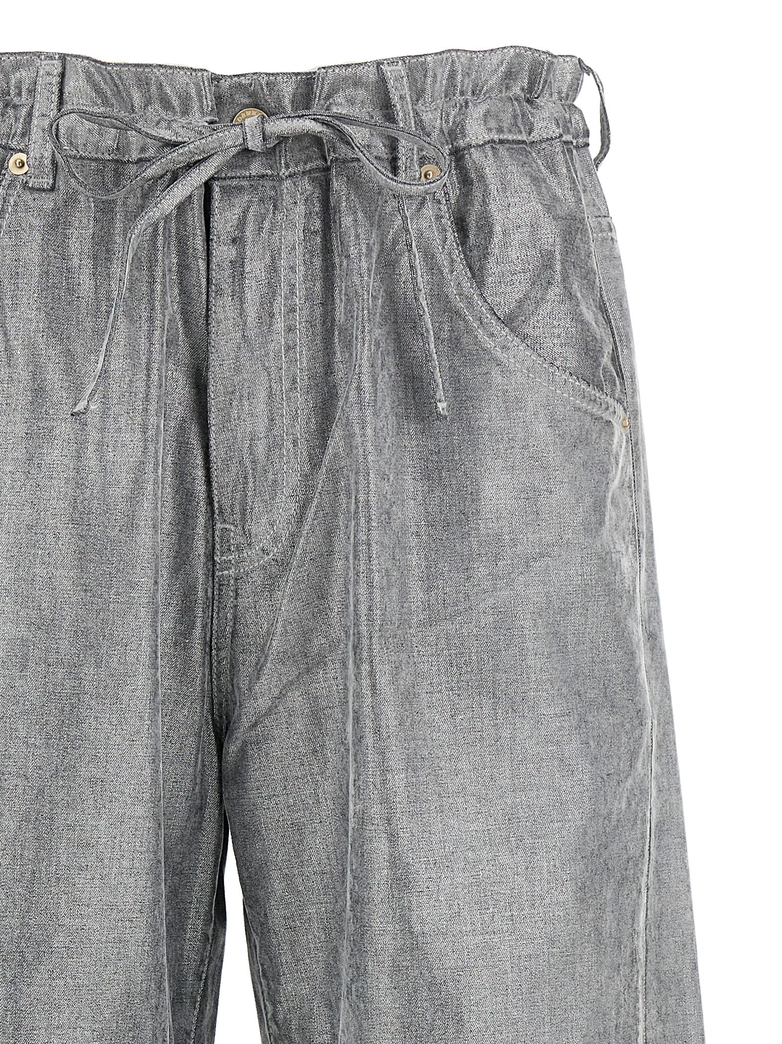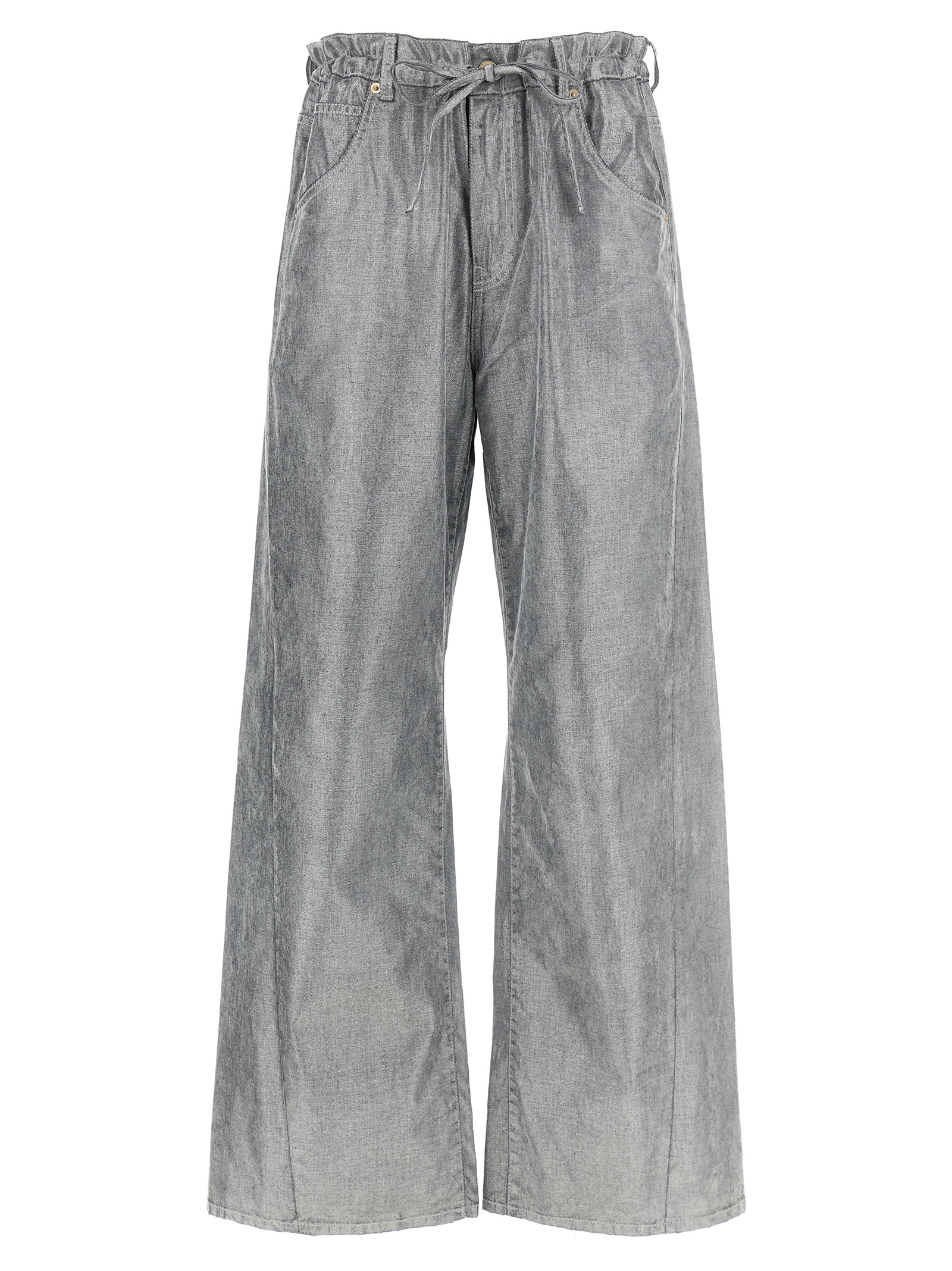 'Iris' cotton denim jeans with flocked and metallic effect, drawstring at the waist, front zip and snap button closure, five pockets, wide leg, leather logo label at the back.
