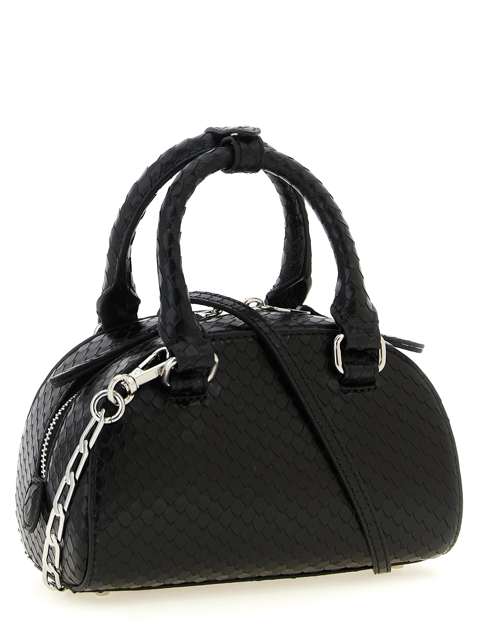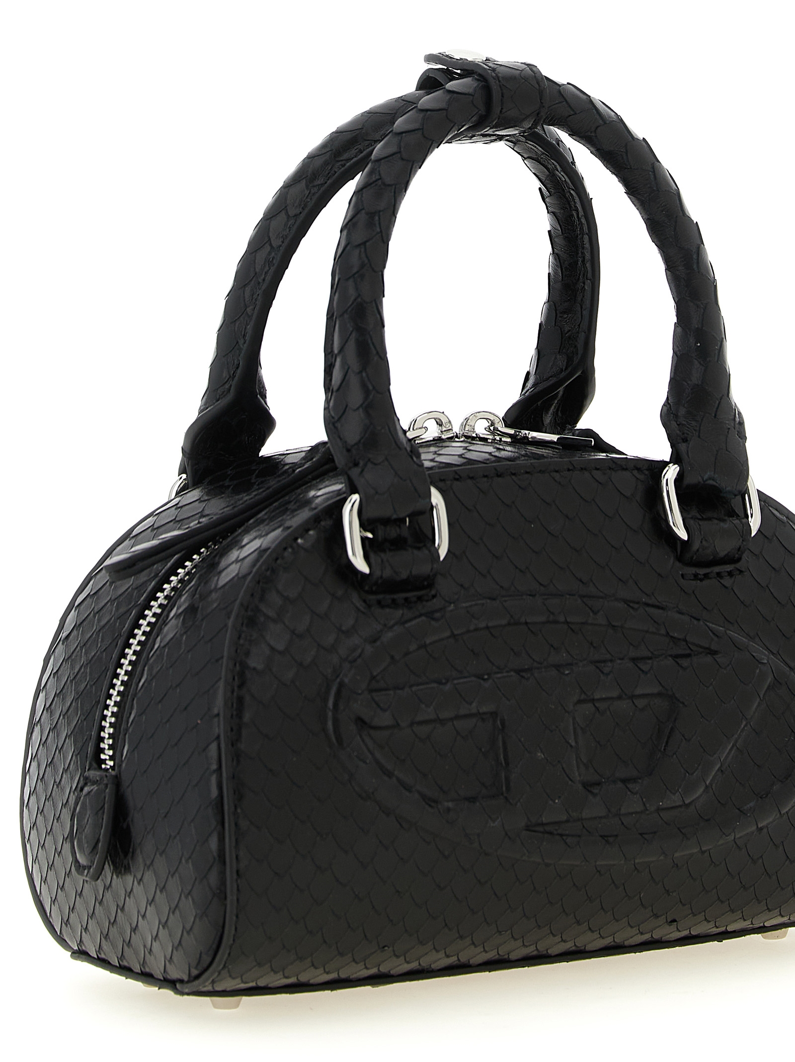 '1DR Dome' mini crossbody bag in Taipan snake-effect embossed leather, Bowling model, high-frequency embossed 'Oval D' logo on the front, top zip closure, double fixed tubular handle, rigid base with metal feet, adjustable and removable shoulder strap.