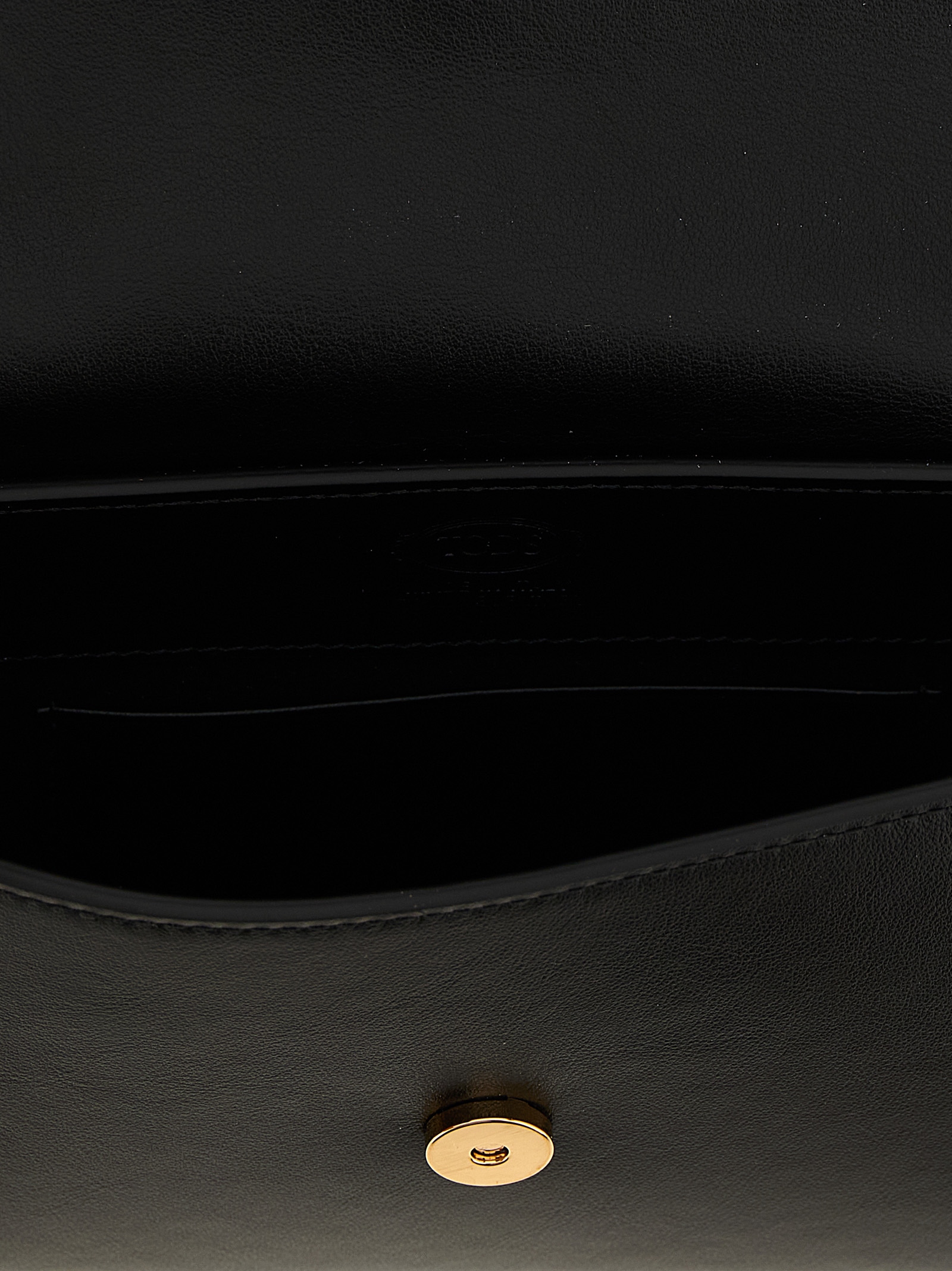 Calf leather shoulder strap, magnetic flap closure with front metal bar detail, chain shoulder strap.