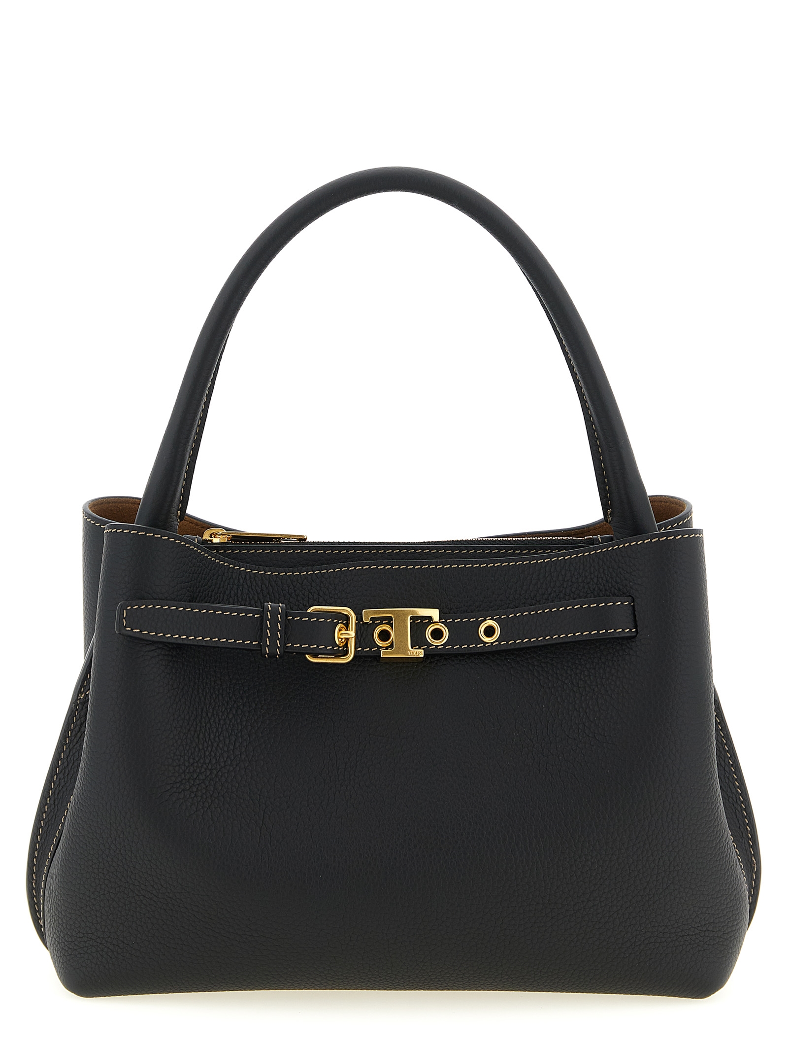 'Tim' mini hammered calf leather handbag with two compartments separated by a central zip pocket, front metal 'T Timeless' buckle belt, fixed tubular handle, inner hook closure for both compartments, rigid base with metal feet, adjustable and removable shoulder strap.