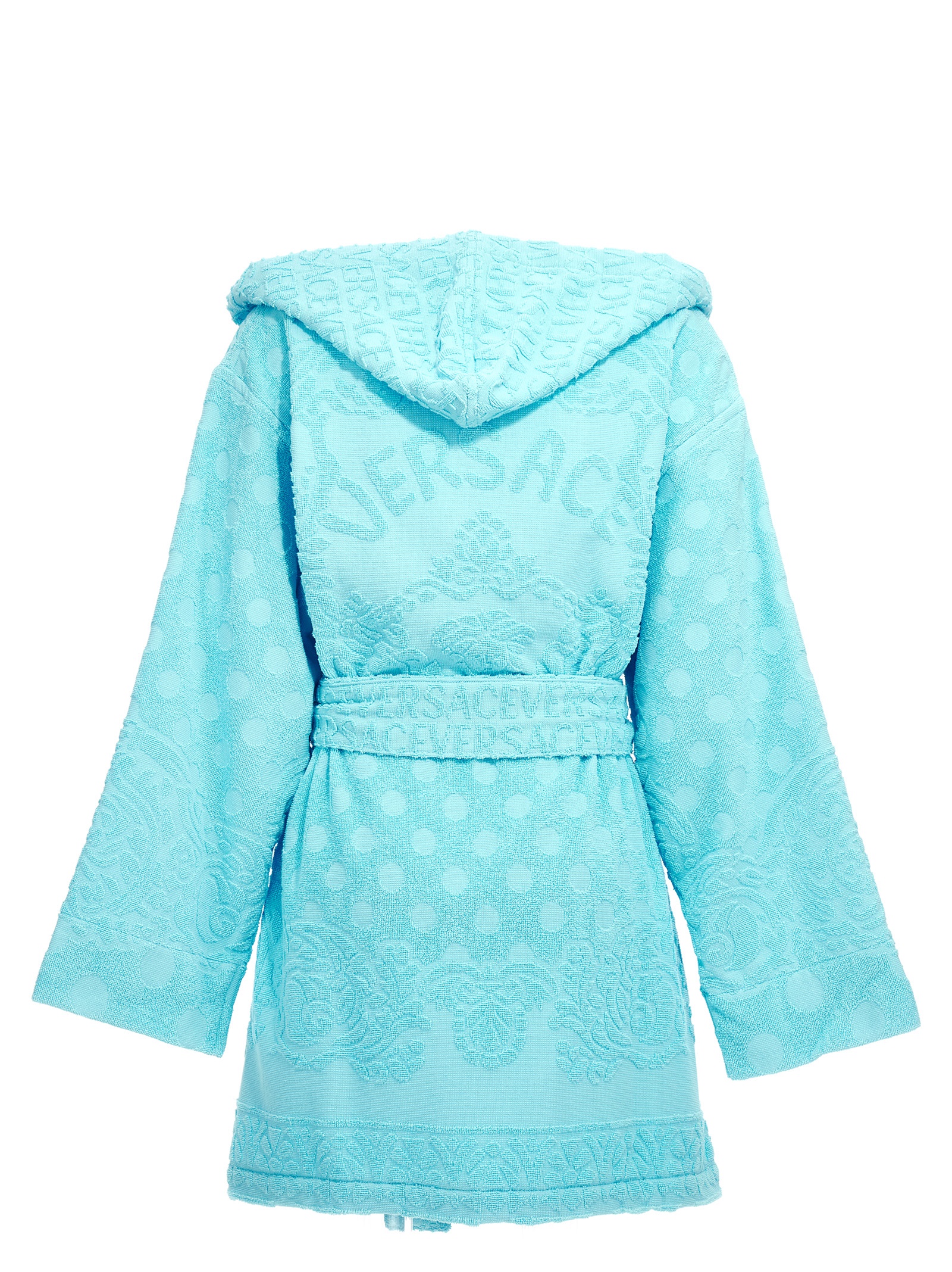 La Vacanza cotton terry cloth short capsule bathrobe with tone-on-tone 'Seashell Baroque Polka Dot' pattern, hood and a belt that can be knotfied at the waist.